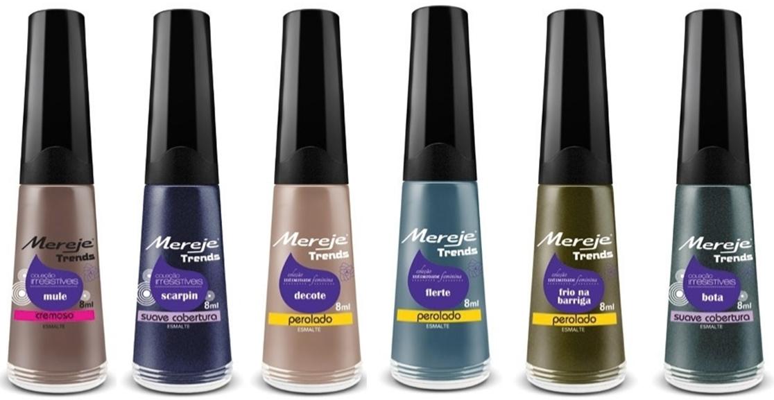A Mereje traz a coleção Irresistíveis - com gama brilhante e pigmentos concentrados, nas cores: Mule, Scarpin, Decote, Flerte, Frio na Barriga e Bota. Preço sugerido: R$ 3,00.