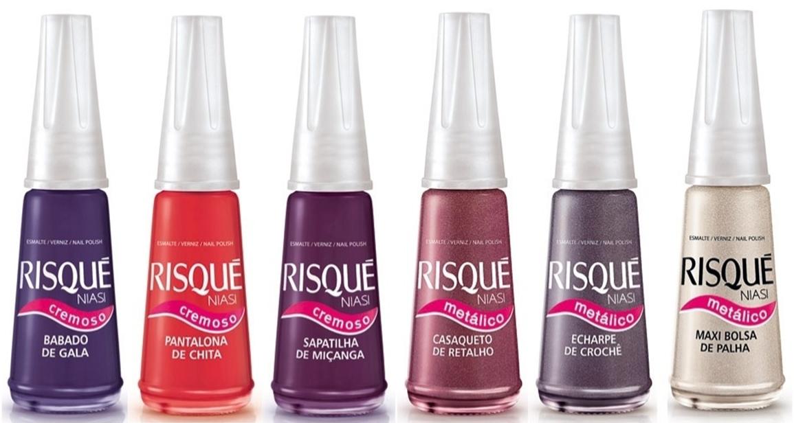 A Risqué traz a Coleção Brasil, com esmaltes cremosos e metálicos. São 06 cores: Babado de Gala, Pantalona de Chita, Sapatilha de Miçanga, Casaqueto de Retalho, Echarpe de Crochê e Maxi Bolsa de Palha. Preço sugerido: R$ 3,00.